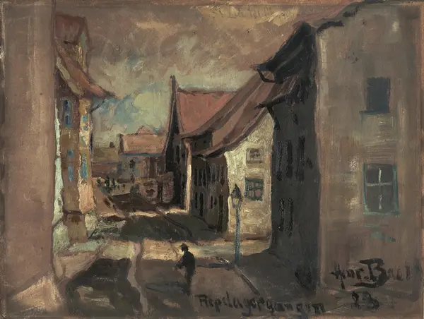 Beskrivelse: Gatebilde med småhus. Tv hus med karnapp. Th gass- lykter på fortau.