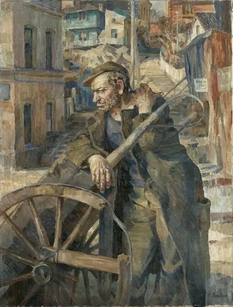 Beskrivelse: I forgrunnen av bildet står Lusefrants og lener seg mot en kjerre. Høyre arm hviler på kjerren. Venstre hånd er lagt på venstre skulder. Ansikt med skjegg i 4/5 profil tv. Kledt i sixpence og stor frakk over arbeidsklær. Hjulet på kjerren er ødelagt. i bakgrunnen småhus i bakke.