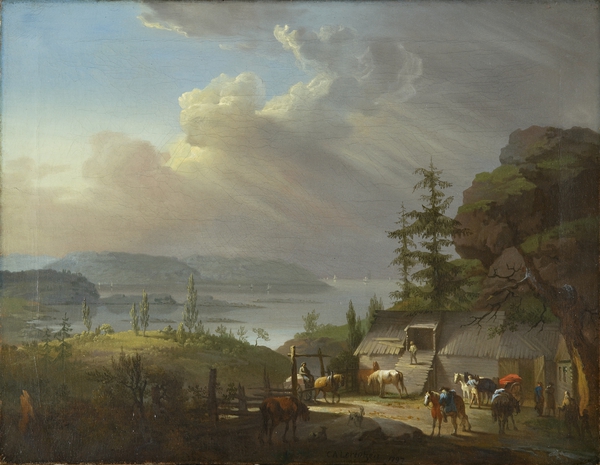 Beskrivelse: I forgrunnen th en tømret låve med låvebroen mot et tun. På tunet en del hester og personer. En mann holder på å stige opp på en hest. En annen kommer inn på tunet sittende på et kjerrelass. I bakgrunnen Oslofjorden med seilbåter.