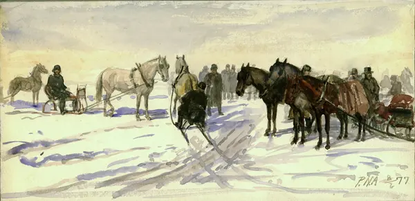 Hester med sleder står oppstilt på isen. I to av sledene sitter menn. En hest med mann i slede er på vei innover i bildet. I bakgrunnen står en del menn og betrakter sceneriet.