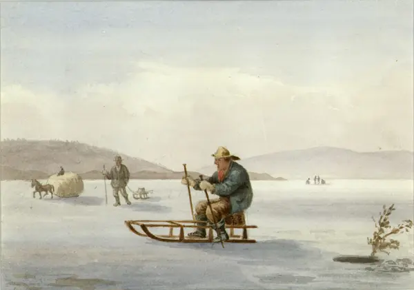 I forgrunnen en mann som aker seg frem på en kjelke med ispigger. I bakgrunnen en mann som drar en kjelke og en annen som sitter på toppen av et høylass som trekkes av en hest.