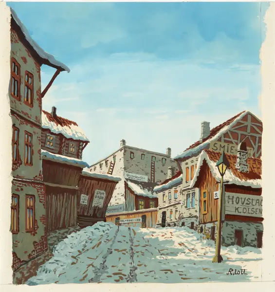 Vintermotiv av gate med små litt falleferdige hus. På flere av husene skilt med f.eks: KUL, KOKS, VED, SKOMAKER og SMIE.