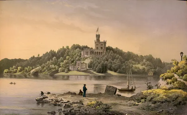 Sett fra Skarpsno. På en liten odde i forgr. ses to menn. Den ene sitter den andre står støttet til en stokk. På høyden th står en klokke i et rundet stativ. På Frognerkilen ligger en seilskjekte med seilene nede th og en robåt tv.