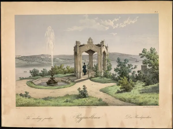En åpen hagepaviljong i nygotisk stil. I denne står en militær person og ser utover Frognerkilen. Tv et springvann.