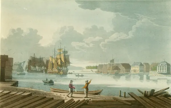 På kaien i forgrunnen står 2 menn den ene slår ut med armene. Th ligger Palépaviljongen og Tollboden. Tv ligger en del seilskuter for fulle seil. Motivet er sett fra bordtomtene.