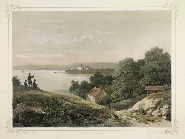 I skråningen i forgr. tv sitter en herre og en dame mens en annen herre står og peker mot Akershus i bakgrunnen. Nedenfor skråningen ligger et hus halvveis skjult av trær og busker.