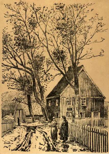 I forgrunnen går Sørkedalsveien ut fra Kirkeveien og over en liten bekk. Det inngjerdete jordet th er nå plassen for Bjørnefontenen. Det gamle spissgavlete huset lå hvor nå den søndre fløy av Majorstuhuset ligger. I forgrunnen to kvinner.