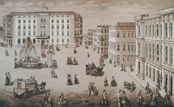 Jernbanegården th. Bakenfor denne en del bygninger som er noe fortegnet. Tv i bakgrunnen Hotel Royal på plassen til det senere Hotel Viking. I forgrunnen Jernbanetorget med mange mennesker og et par hestekjøretøyer. Et stort springvann.