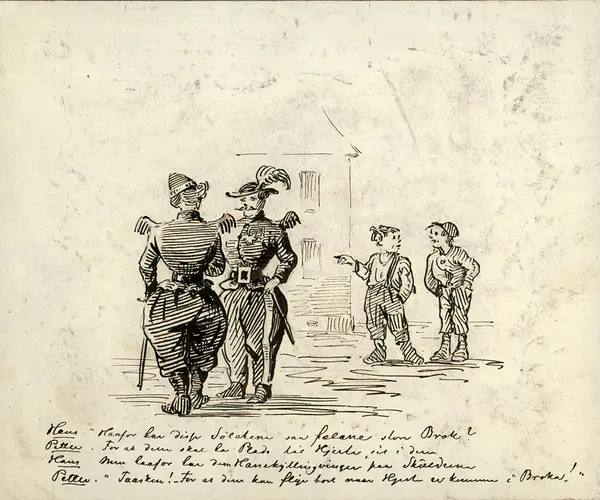 replikkveksling mellom to gutter om påkledningen til to soldater