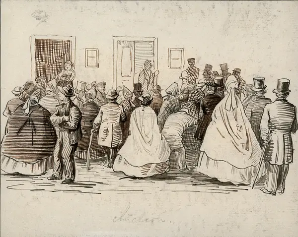 auksjon, folkeliv, kvinner, menn, auksjon, kunst, anitikviteter, ddrakt, hodeplagg
