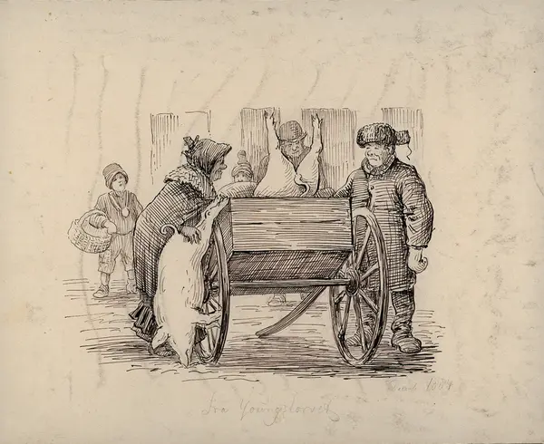 marked, kjøttsalg, gris, kjerre, mann, kvinne