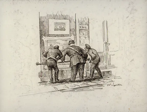 En politimann (?) og to menn lener seg frem, ser på kunst (?)