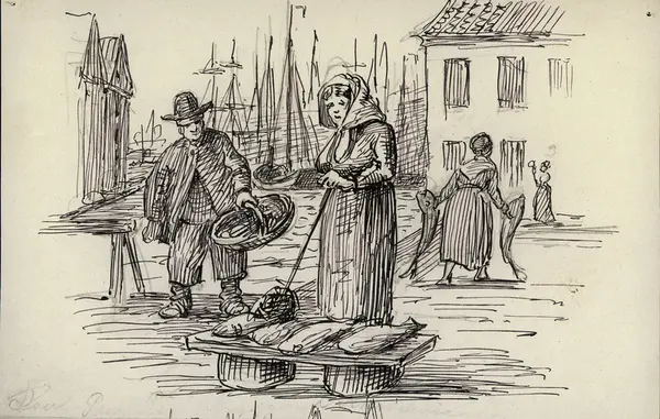 fiskebrygge, handel, kai, fiskebåter, kvinner, menn, fisk, bygninger, skipsmasterb