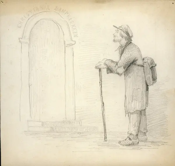 En litt loslitt mann står støttet mot en stokk og ser på en port hvorover det står: CHRISTIANIA DAMPKIØKKEN.