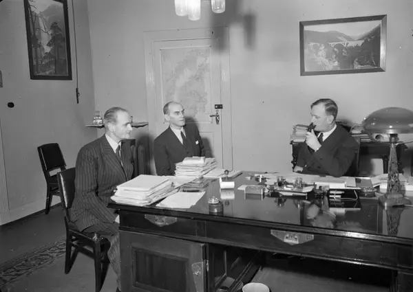 Nils Langhelle var Ap-politiker, og hadde fire ulike statsrådposter i perioden 1945–1955. Stortingspresident 1958–65. Medlem av Nobelkomiteen. Fotografiet bak Langhelles skrivebord viser Kylling jernbanebru i Romsdalen.