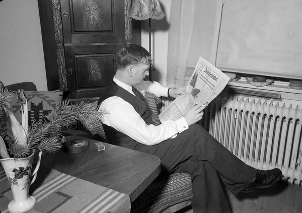 serie "En dag med statsråd Langhelle", samferdselsminister, interiør, stue, avislesning, Arbeiderbladet