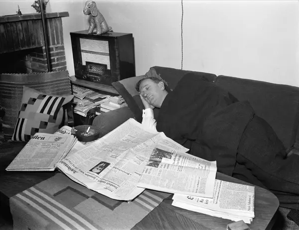 serie "En dag med statsråd Langhelle", samferdselsminister, interiør, stue, sofa, middagshvil, aviser, radio