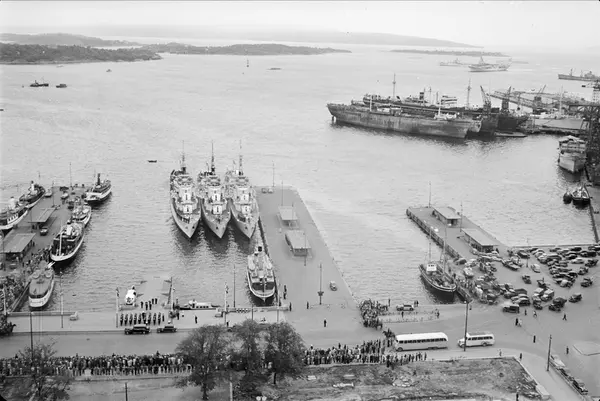 Fortøyd ved utstikker C: de norske jagerene (fra venstre) KNM Stavanger, KNM Trondheim og KNM Oslo. Ute i fjorden, det britiske hangarskipet HMS Vengeance og jagerene HMS Sluys og HMS Cadiz.