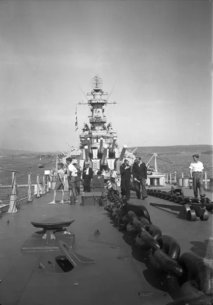 30. juni 1947 kom de amerikanske slagskipene USS New Jersey og USS Wisconsin til Oslo. 2. juli ble USS New Jersey inspisert av Kong Haakon VII. Den sirkelformede radarantennen (SK-2) på fortoppen viser at dette bildet er tatt ombord på USS New Jersey da USS Wisconsin aldri hadde SK-2. Ref. Afenpostens aftennummer 30. juni 1947, bl. a.