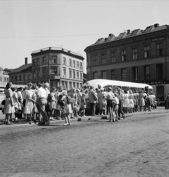 bussholdeplass, mennesker, kø, buss til Ingierstrand badested, bygårder