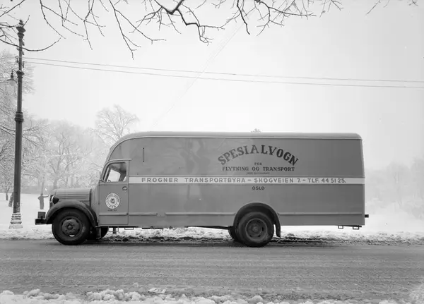 Volvo "rundnese" 1946-50 med reg.nr. A-48451. Undertekst Leievogn tilsier at bilen har løyve til godstransport utenfor rute iht. samferdselsloven av 1947.