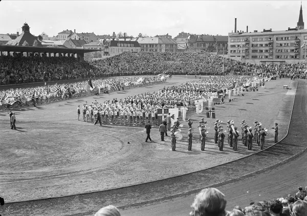 Bislett stadion, Holmenkollstafetten, åpningsseremoni, defilering, deltakere, faner, flagg, publikum
