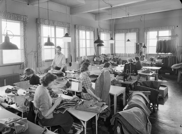 Udis (Udnæs & Isachsen) konfeksjonsfabrikk, interiør, produksjonslokale, arbeidere, kvinner, syersker, mann, presser