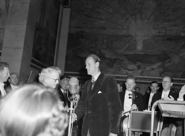 Helt til venstre fiolinistene Ernst Glaser og Kai Angel Næsteby. Mellom Pauline Hall og mikrofonen skimtes dirigenten Øivin Fjeldstad. Cellisten rett under Munchs "Solen" er Arne Melsom. Mannen som Pauline Hall veksler håndtrykk med er den danske komponisten Vagn Holmboe. Bildet er sannsynligvis tatt i forbindelse med ISCM-festivalen i 1953. ISCM står for International Society for Contemporary Music.