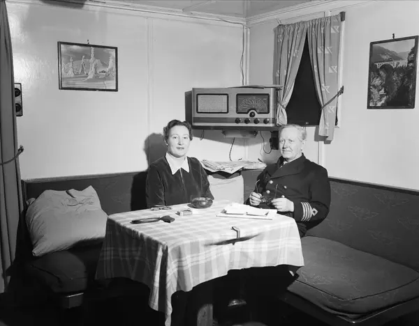 d/s Bruse, havn, interiør, lugar, mann, kaptein, kvinne, radio