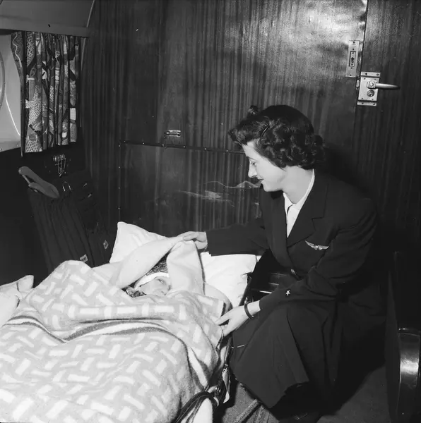 SAS, flytur Oslo - Bodø, flymaskin Dan Viking, propellfly, interiør, sykebåre, pasient, flyvertinne