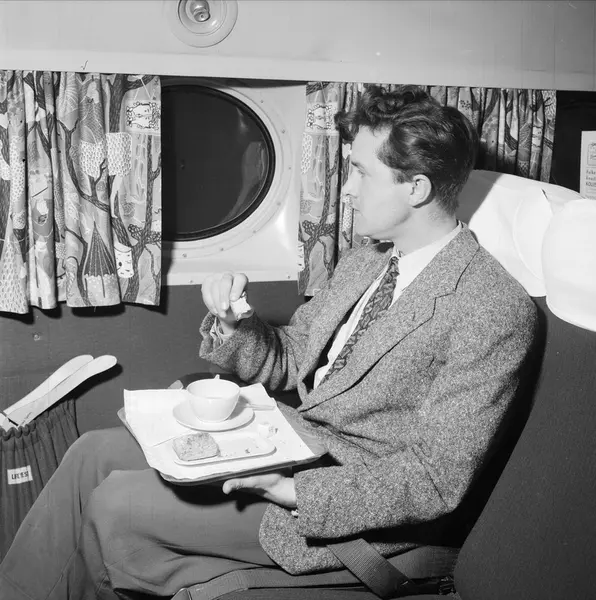 SAS, flytur Oslo - Bodø, flymaskin Dan Viking, propellfly, interiør, kabin, passasjer, serveringsbrett, te, kake