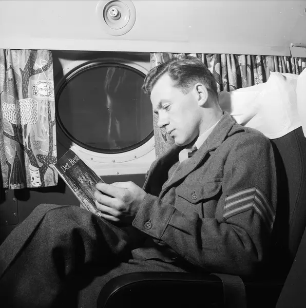 SAS, flytur Oslo - Bodø, flymaskin Dan Viking, propellfly, interiør, kabin, passasjer, soldat, lesning, Det Beste