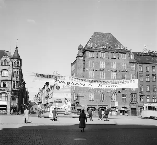 torg, gateløp, forretningsgårder, mennesker, biler, gateliv, banner: Landsorganisasjonens kongress