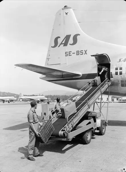 Oslo lufthavn Fornebu, SAS-fly, transportbånd for bagasje, menn