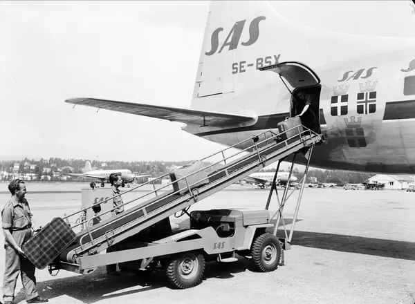 Oslo lufthavn Fornebu, SAS-fly, transportbånd for bagasje, menn