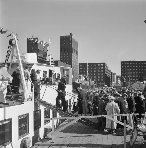 Oslo stein-, jord- og sementarbeideres forening, båttur, menn, kvinner, ombordstigning i St. Hallvard, Rådhuset, kontorbygninger