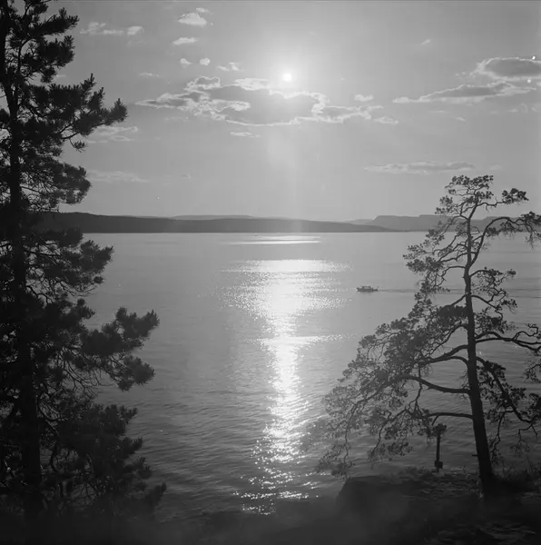 utsikt, fjord, solnedgang, furutrær, motorbåt