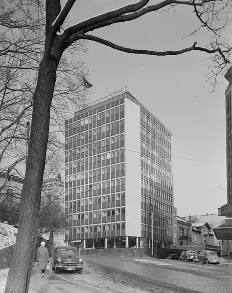Dovregården, Forsikringsselskapet Dovre, kontorbygning, biler, kvinne, bygårder