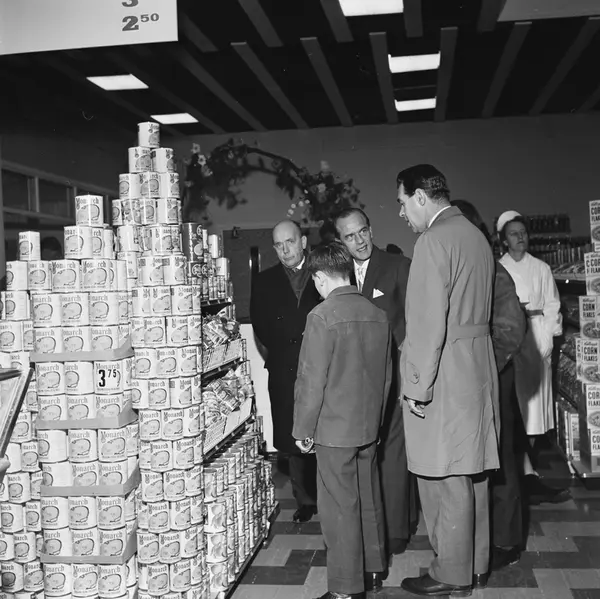 åpning av Bøler senter, Oslo samvirkelag, interiør, matvareavdeling, ekspeditrise, kunder, ordfører