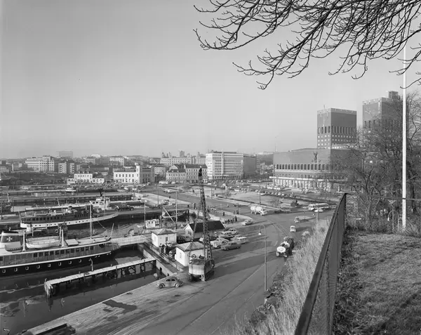 utsikt, havn, båter, forretningsgårder, Vestbanestasjonen, Rådhuset, biler, busser, mennesker, gateliv, kran
