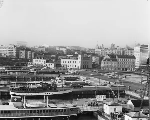utsikt, havn, båter, bygårder, forretningsgårder, Vestbanestasjonen, biler, mennesker, gateliv