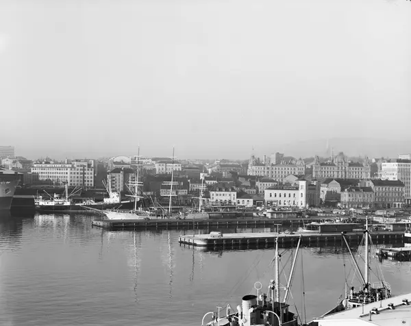 utsikt, havn, båter, skip, skoleskip Christian Radich, godsbåt Vardø, forretningsgårder, Akers mek. Verksted, Vestbanestasjonen, bygårder, biler, mennesker, gateliv