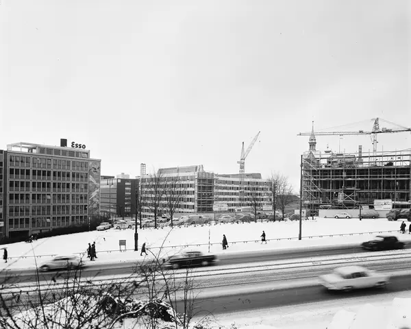 utsikt, plass, kontorbygninger, Kommunenes hus, Storebrand forsikring, Utenriksdepartementet, byggevirksomhet, kraner, mennesker