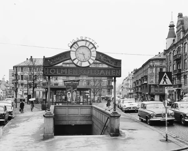 nedgang til Valkyrie plass stasjon, park, kiosk, bygårder, biler, mennesker, gateliv