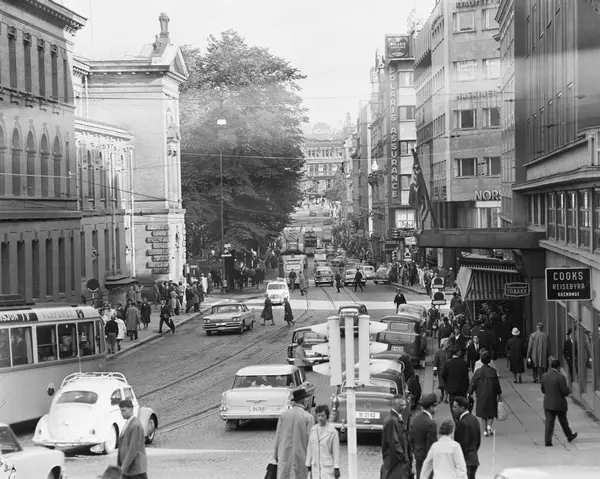 gateløp, biler, trikker, mennesker, gateliv, Nationaltheatret, forretningsgårder, Hotel Continental