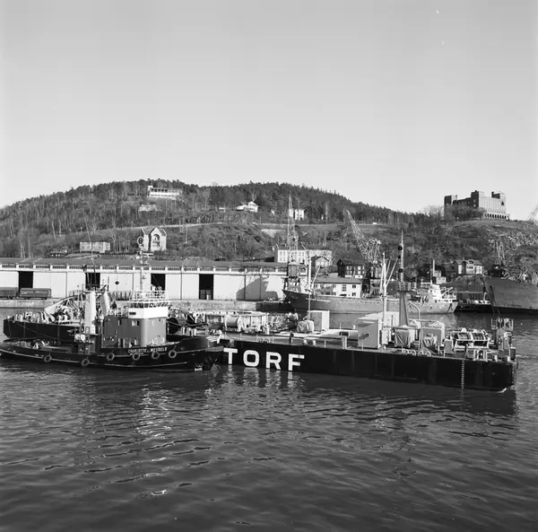 havn, båter, slepebåt Charlotte Wessels, kabelleggingsfartøy Harmstorf, skip Karthrine Dancoast, bygårder, villabebyggelse, Ekebergrestauranten, Sjømannsskolen