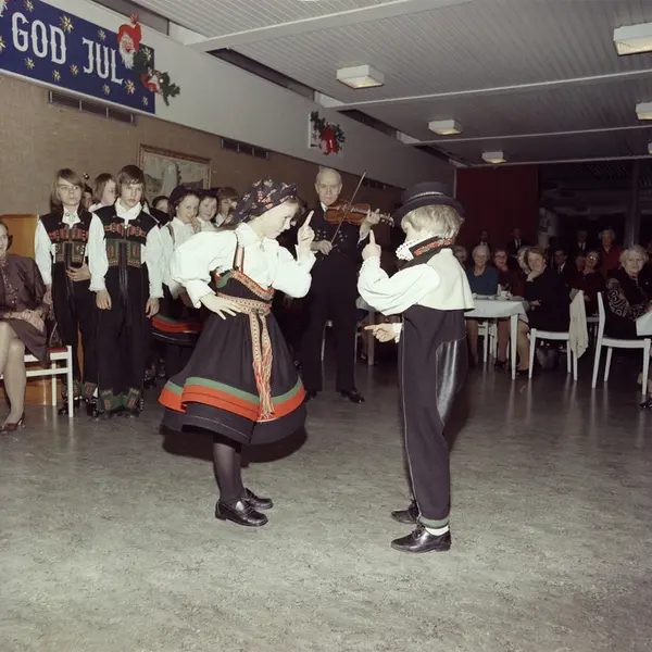 Tiedemanns tobakksfabrikk, interiør, kantine, Norsk Folkemuseums leikarring, juletrefest, felespiller, barn