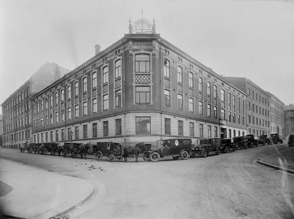 Tiedemanns tobakksfabrikk, hester, vogner, biler, bygårder