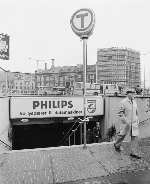 Jernbanetorget T-banestasjon, nedgang, trapp, mennesker, reklameplakater, forretningsgårder