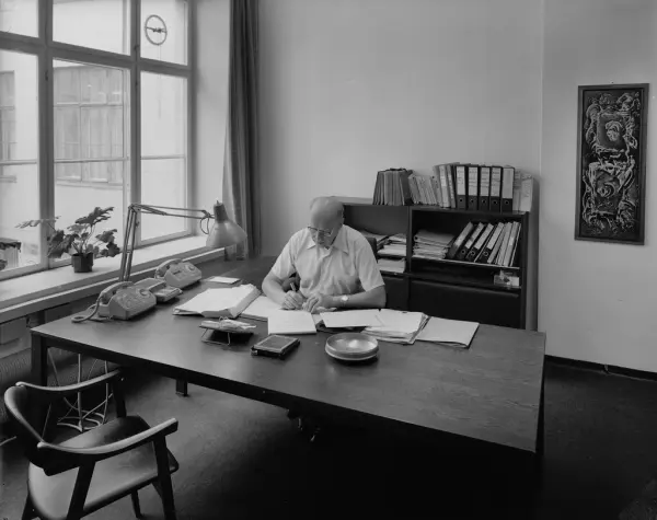 H. Bjørnstad & Co., interiør, kontor, mann, sittende halvfigur ved skrivebord